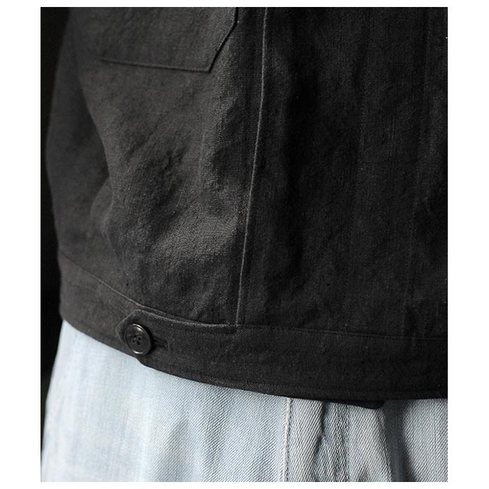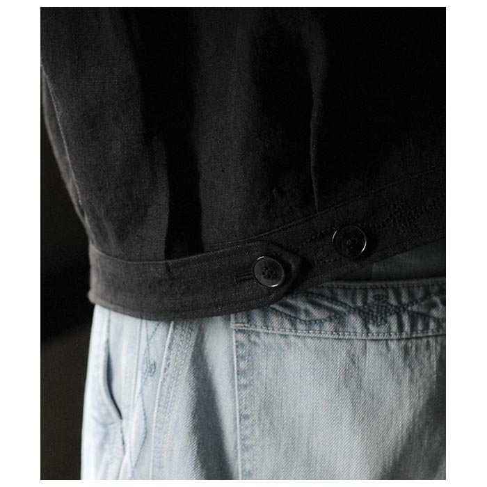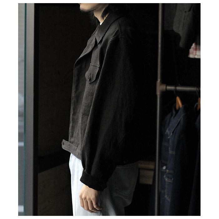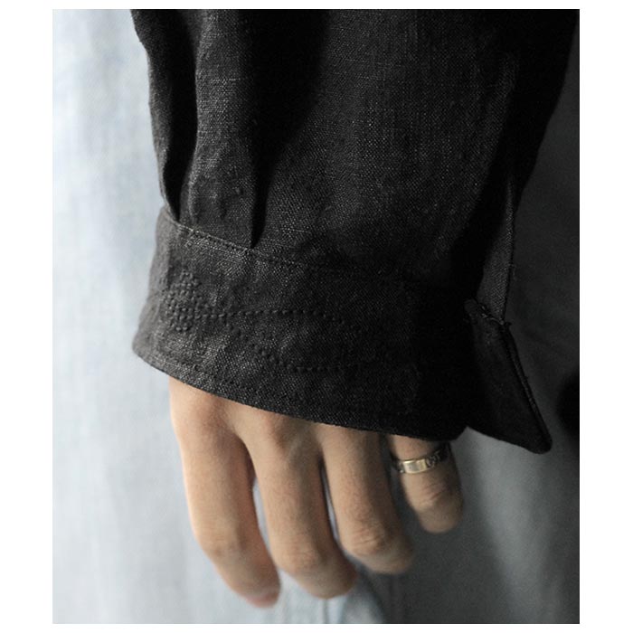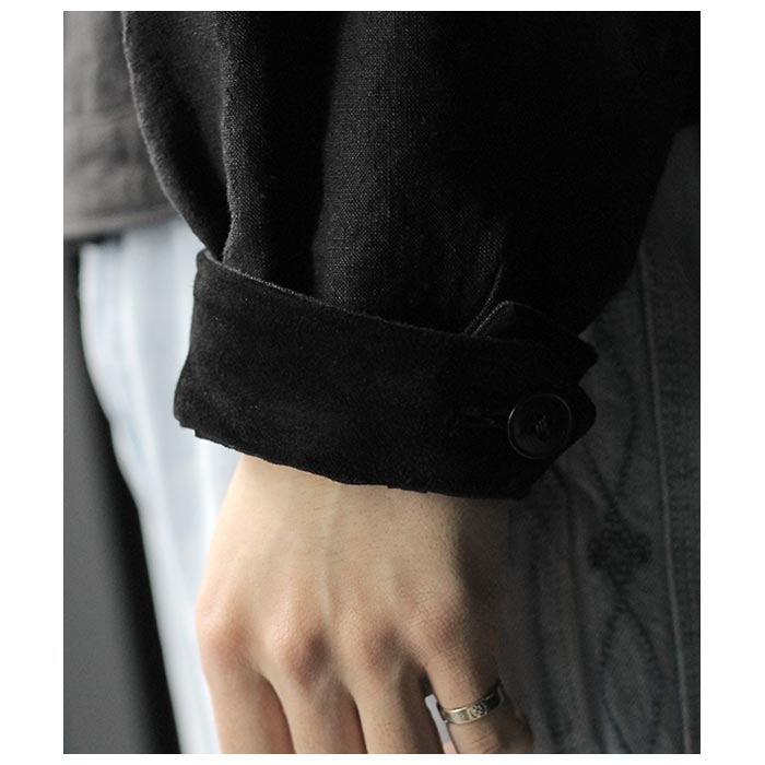 生地にはヘビーオンスのヘンプ生地を使用。リネンに似たハリコシと上品な光沢感を持ち、着用を繰り返すことで経年変化も楽しめます。袖裏、襟裏、腰裏に配したゴートスウェードレザー、袖口の手刺繍がサルトらしいアクセントになっているのが魅力。繊細な技術と手間のかかったスペシャルなジャケットです。 |