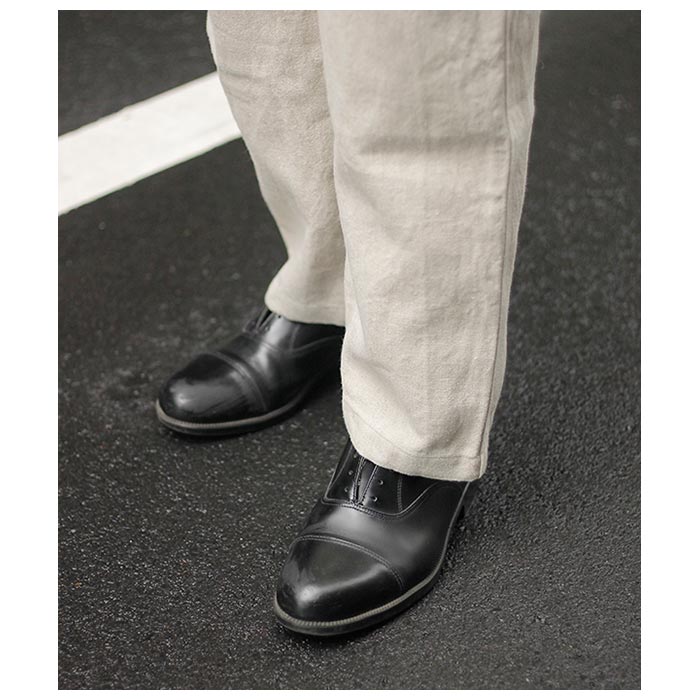 商品の詳細はhttps://mittan.asia/PT-92/をご覧ください。 またお直しにつきましてはhttps://mittan.asia/repair/をご覧ください。過去に廃盤になったものの、本企画の為に再び生産した生地を使用しています。二種類の麻、亜麻(リネン)と苧麻(ラミー)の国内紡績の混紡糸を経糸と緯糸に使用することでハリ感と適度な厚みが表現されています。また、亜麻独特のたわみ感が苧麻と混紡されることで軽減されています。着用を繰り返すことでまるで古布のような風合いになります。