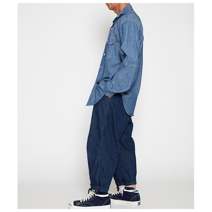 る定番の5ozシャンブレー の生地。経糸をロープ染色し旧式の軽布用力織機を使用して製織しています。 力織機を使用する事で、薄手ですが洗い後もしっかりとしたハリコシが残ります。 |