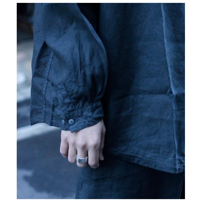 またお直しにつきましてはhttps://mittan.asia/repair/をご覧ください。 定番の大麻生地と近しい生地厚ですが、織り密度をややタイトに仕上げ、織り上がった後に滋賀の整理工場で生地加工を施し、大麻特有のハリ感を予め柔らかく調整しています。通常の平織り大麻を長く着用することで得られる柔らかさが、最初から備わっているのが特徴です。 身幅に大きくゆとりを持たせたワイドシルエットのシャツです。たっぷりとした生地量ですが、柔らかな素材を使用しているため、自然な波打ちや落ち感が感じられます。平面的なシルエットながら、袖口から裾にかけてマチを入れることで、身体の厚みをカバーしつつ、運動量を確保しています。裾は自然なカーブを描いており、見返し仕様になっています。ボタンには貝ボタンを使用しています。 ※天然素材独特の糸の節やムラ感があります。風合いを重視し、繊維長が不均一な原料を使用している為ですので、表情の一部としてお考えください。生地の糸が切れ、穴が開く可能性がある為、糸の節は無理に引っ張らないようご注意ください。 ※草木染のムラ感や経年変化をお楽しみください。摩擦による色移りを防ぐ為に、淡色のものとの使用を控え、中性洗剤で単独洗いして陰干ししてください。汗や太陽光により変退色しますので、保管など取扱いにご注意ください。 |