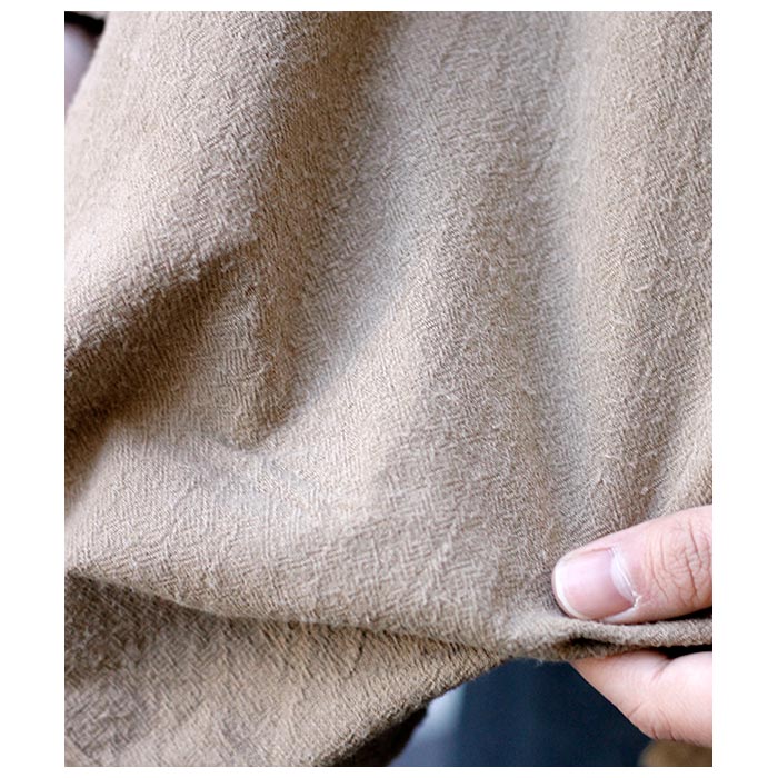 またお直しにつきましてはhttps://mittan.asia/repair/をご覧ください。 遠州産地で製織された楊柳生地で、経糸には綿糸、緯糸には綿の強撚糸と絹糸を交互に打ち込んで、低速でゆっくりと織り上げています。強撚糸と通常の糸を交互に使用することで、程よい柔らかさのシボ感が生まれ、独特の表情を持つ生地に仕上がっています。この生地は、シャトル織機を改造したレピア織機を使用し、スラブ糸の細い部分に強いテンションがかからないよう慎重に織り上げており、手織りのような柔らかな風合いを引き出しています。 身幅に大きくゆとりを持たせたワイドシルエットのシャツです。たっぷりとした生地量ですが、柔らかな素材を使用しているため、自然な波打ちや落ち感が感じられます。平面的なシルエットながら、袖口から裾にかけてマチを入れることで、身体の厚みをカバーしつつ、運動量を確保しています。裾は自然なカーブを描いており、見返し仕様になっています。ボタンには貝ボタンを使用しています。 ※強撚糸を使用している為、着用により伸びることがありますが、洗濯後に寸法を整えて干すと、元の寸法に戻ります。天然素材独特の糸の節やムラ感は生地の表情とお考えください。糸の節を引っ張ると糸が切れる場合がある為、ご注意ください。 ※草木や虫から抽出した染料による染色のため自然のムラ感があります。色移りの可能性があるので、初めは淡色のものとの使用は控え、中性洗剤で洗濯してから陰干してください。製品染めの為、1点1点、色の出方やサイズが微妙に異なります。 |