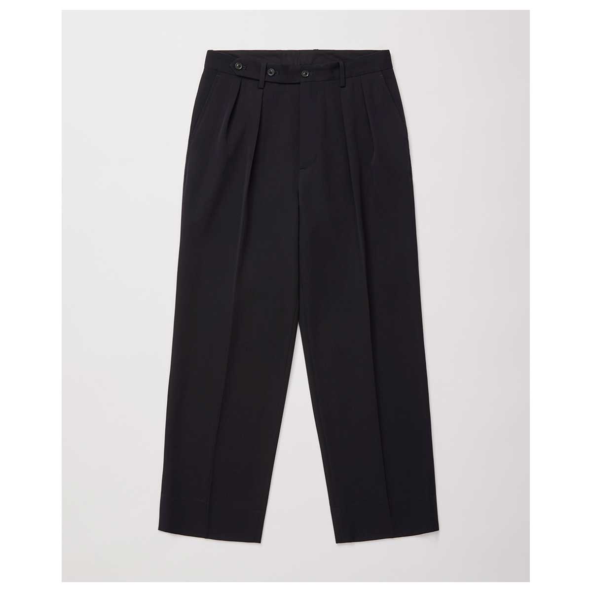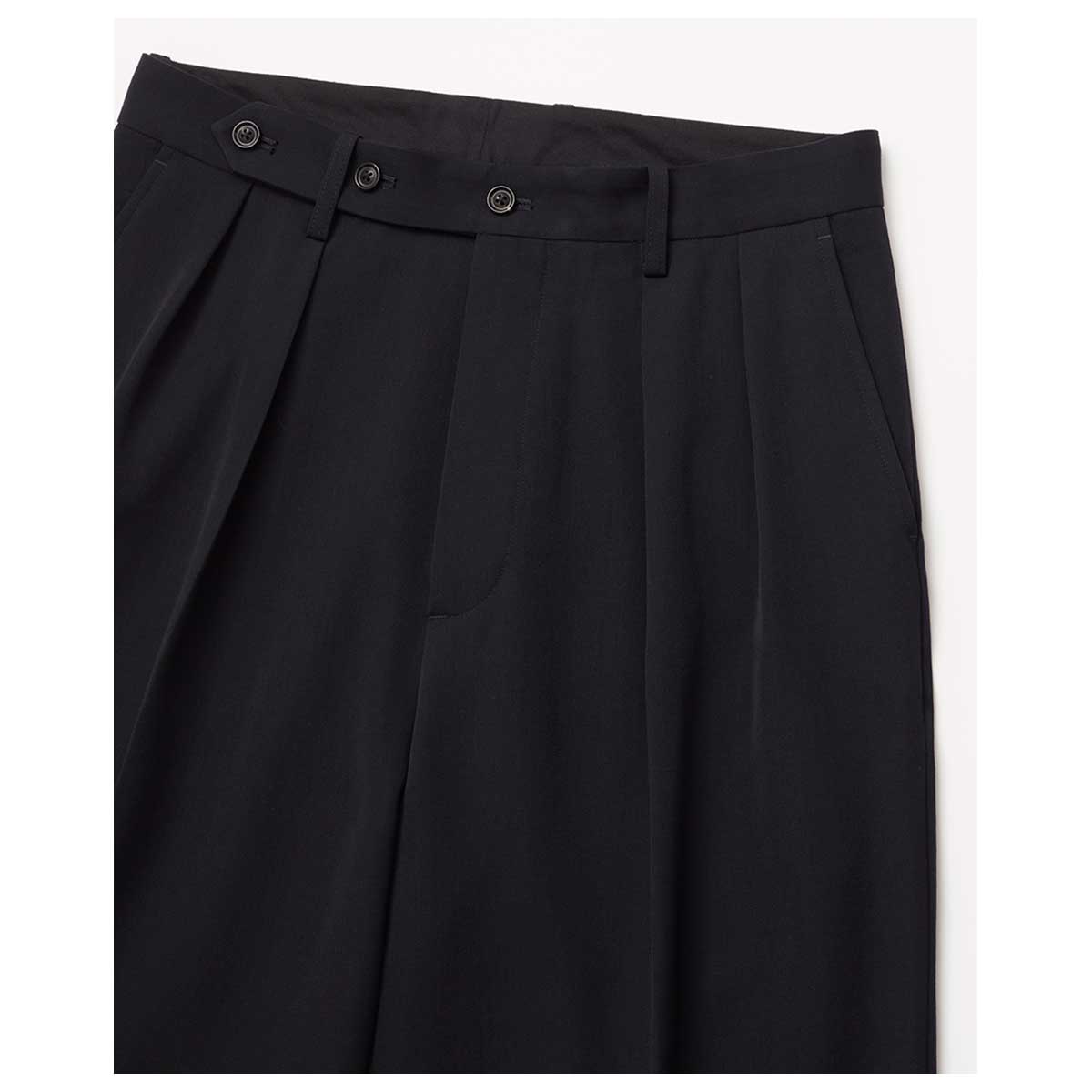 ブランドを代表するモデルである3連ボタンが特徴的なミリタリー2タックトラウザー ズをシルエットや仕様を見直しアップデート。モチーフとなったミリタリーやワークパンツの残像を残しながら、素材の落ち感を活かしたセミワイドシルエットを採用することで、タフさと繊細さを持ち合わせたパンツに仕上げています。