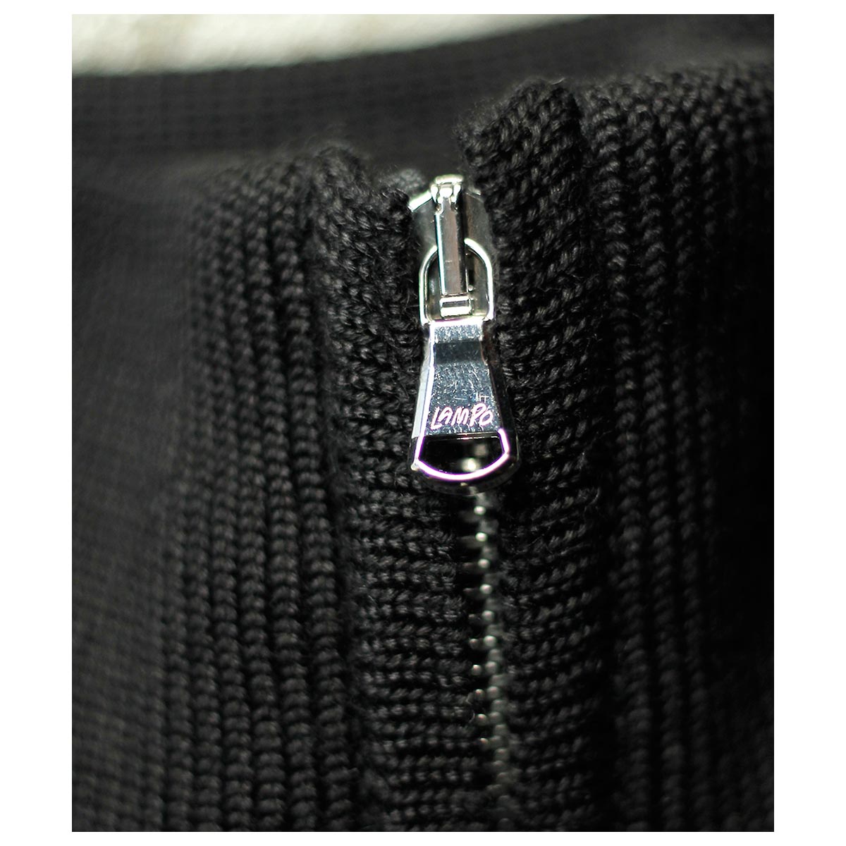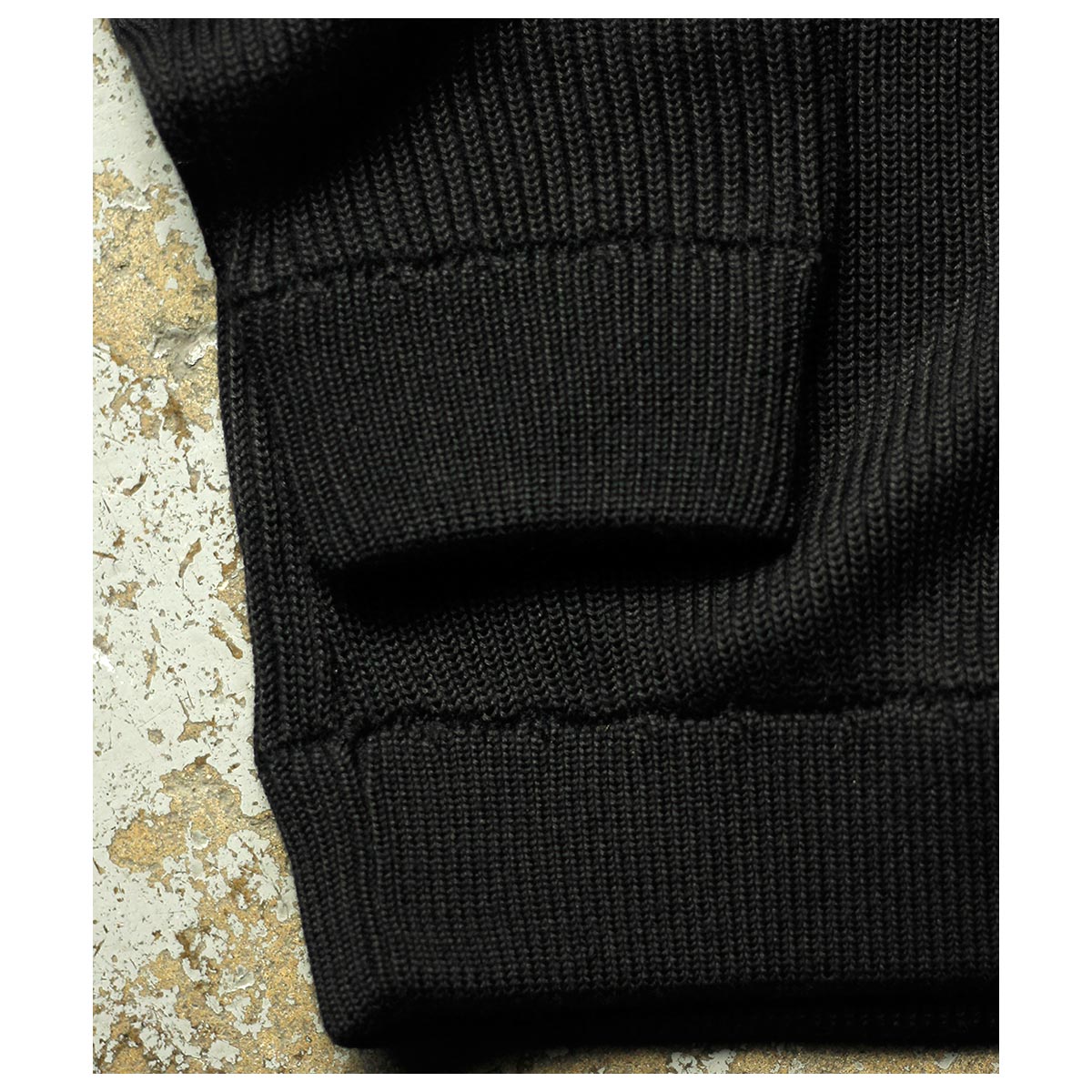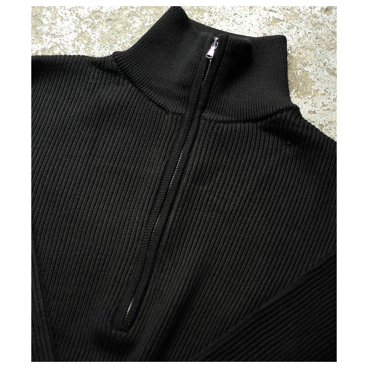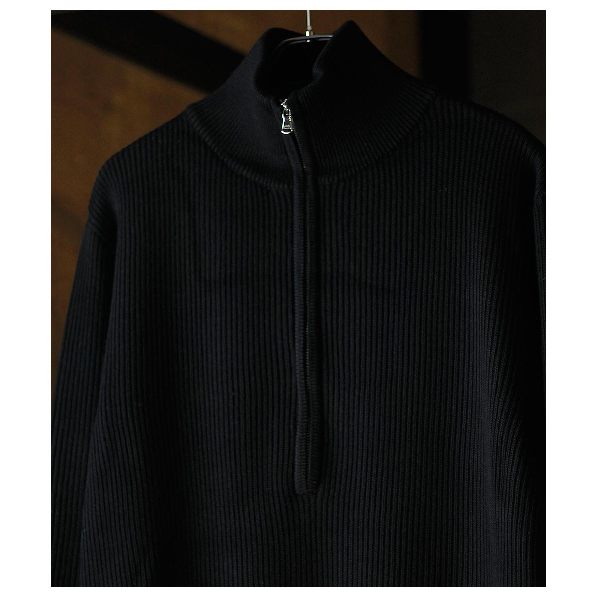 本来であればスーパーハイゲージニット用に使われる極めて細番手の糸を超多本取りして製作した ハーフジップニット。アウターとしての着用も想定し、着丈と袖丈をやや長めに設定しました。 これだけの細番手を超多本取りにするだけでも非常に難易度が高い中、熟練のニッターの手によって両畦での成型編みにトライしました。同じよう な重量感のニットにはない独特の光沢感、しなやかさを持つ特別な一着です。 前立てには伊ランポー社のジッパーを使用。今なおイタリア国内で、熟練の職人による生産を貫く高級ジッパーです。