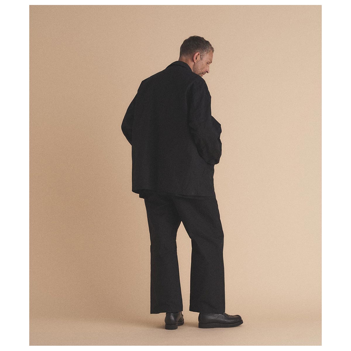 新型のストレートパンツはタック仕様で上品な印象に仕上げました。装飾を極力そぎ落とし、裾に溜まりが出ないようレングスを丁寧に調整しています。革靴、スニーカー、サンダルなど、足元を選ばず合わせられるリラックスシルエットが特徴です。YKKジッパーと本水牛ボタンを採用し、見えない部分の上質さも大切にしています。 |