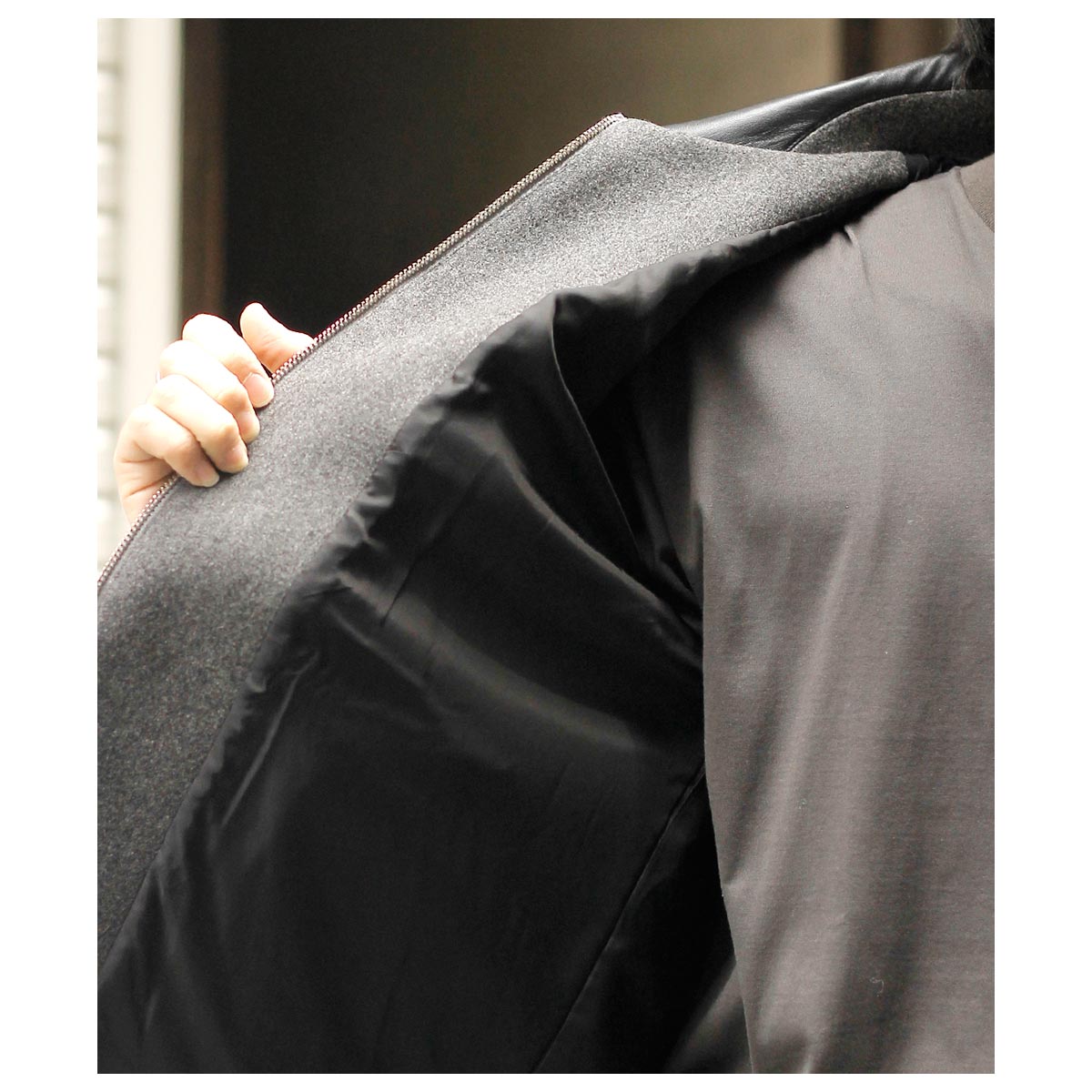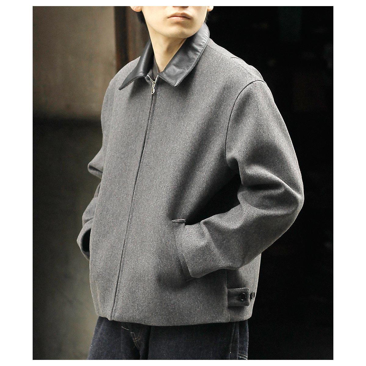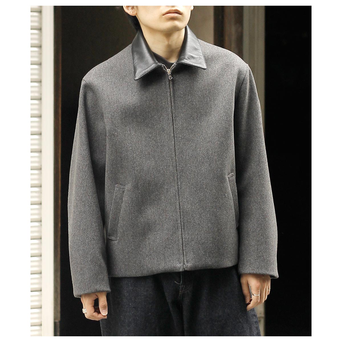 インテリム INTERIM ヘビー メランジ フェルテッド ヴァージン ウール デッドストック レザーカラー ハリントン ジャケット HEAVY MELANGE FELTED VIRGIN WOOL DEADSTOCK LEATHER COLLAR HARRINGTON JACKET (IT25A107)