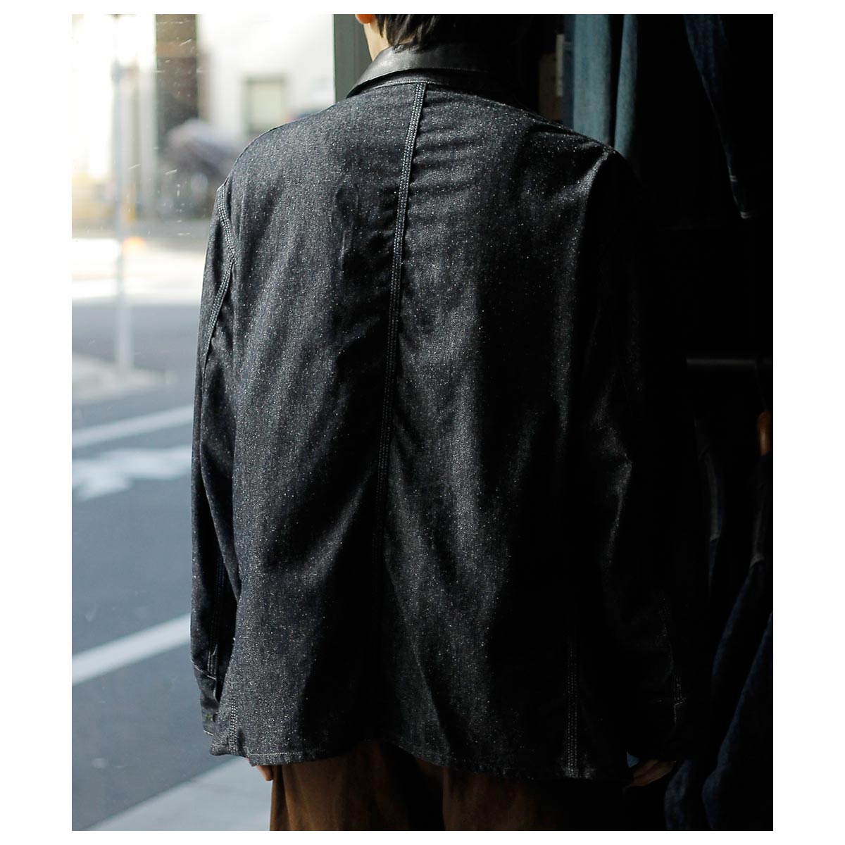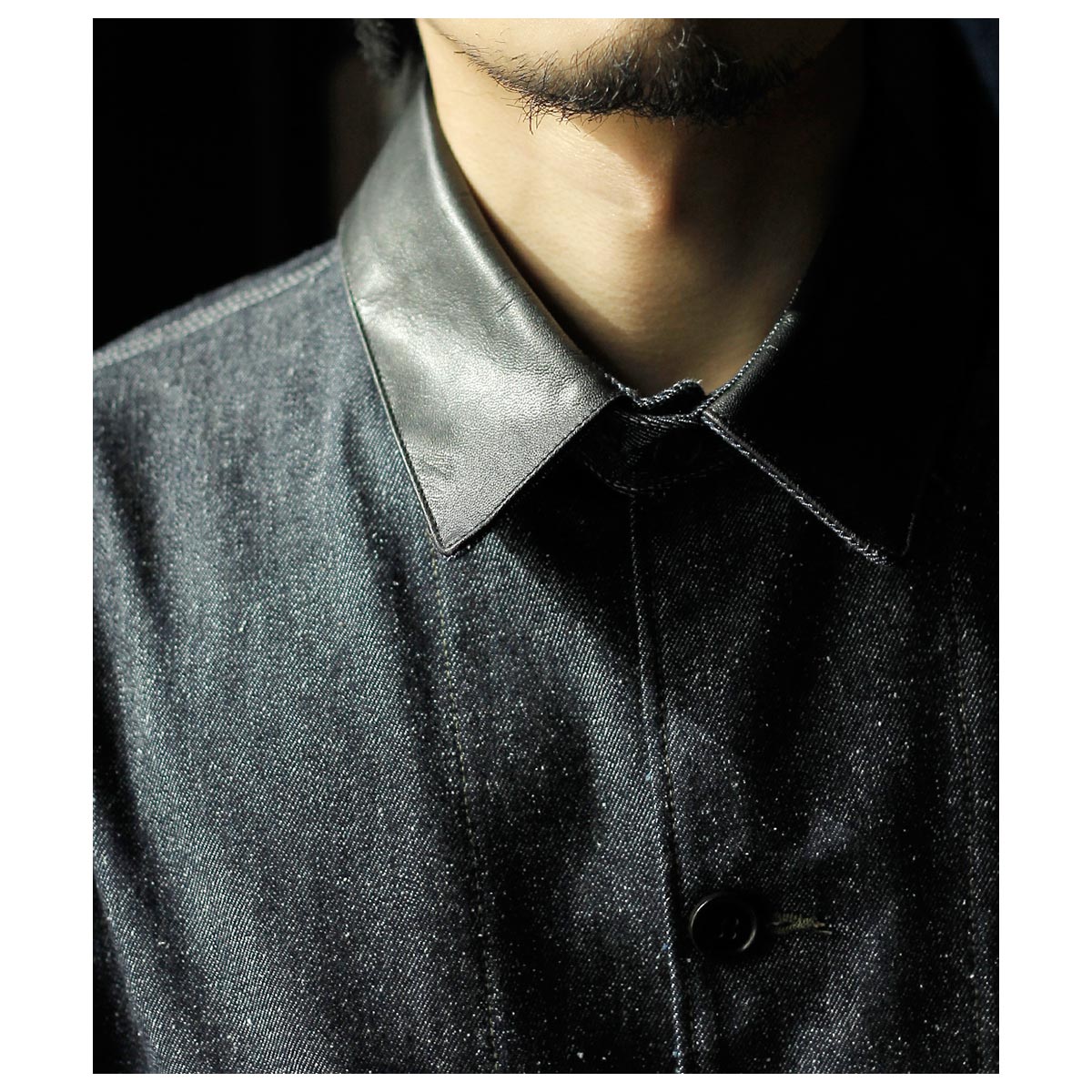 インテリム INTERIM ゴート レザー シルク ノイル デニム 1st ヘラクレス カバーオール GOAT LEATHER COLLAR SILK NOIL DENIM 1st HERCULES COVERALL (IT26S043)