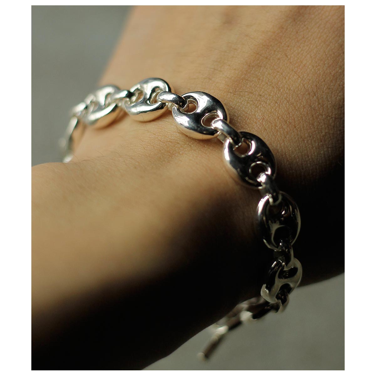 イタリア製の貴重なシルバー925ブレスレット。 伝統的なデザインである2種類のアンカータイプをすっきりとした印象のT字の留め具でご用意しました。いずれも上質なシルバーならではの程よい重厚感と輝きが魅力で、シンプルながら存在感のある仕上がりです。メキシコ・タスコ製の武骨な雰囲気とは異なり、イタリア製ならではの繊細で上品な磨き込みが施され、洗練された印象を与えます。長さは18cm、20cm、22cmの3サイズ展開で、男性はもちろんよりユニセックスに寄せた表情に。カジュアルからドレススタイルまで幅広く 活躍するジュエリーに仕上げました。