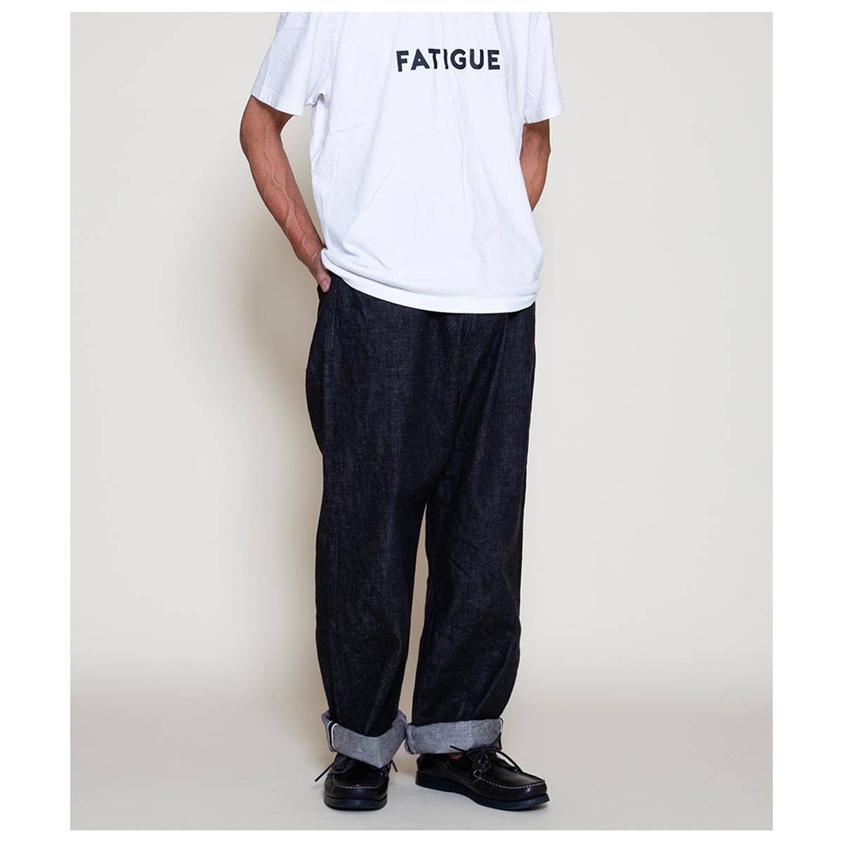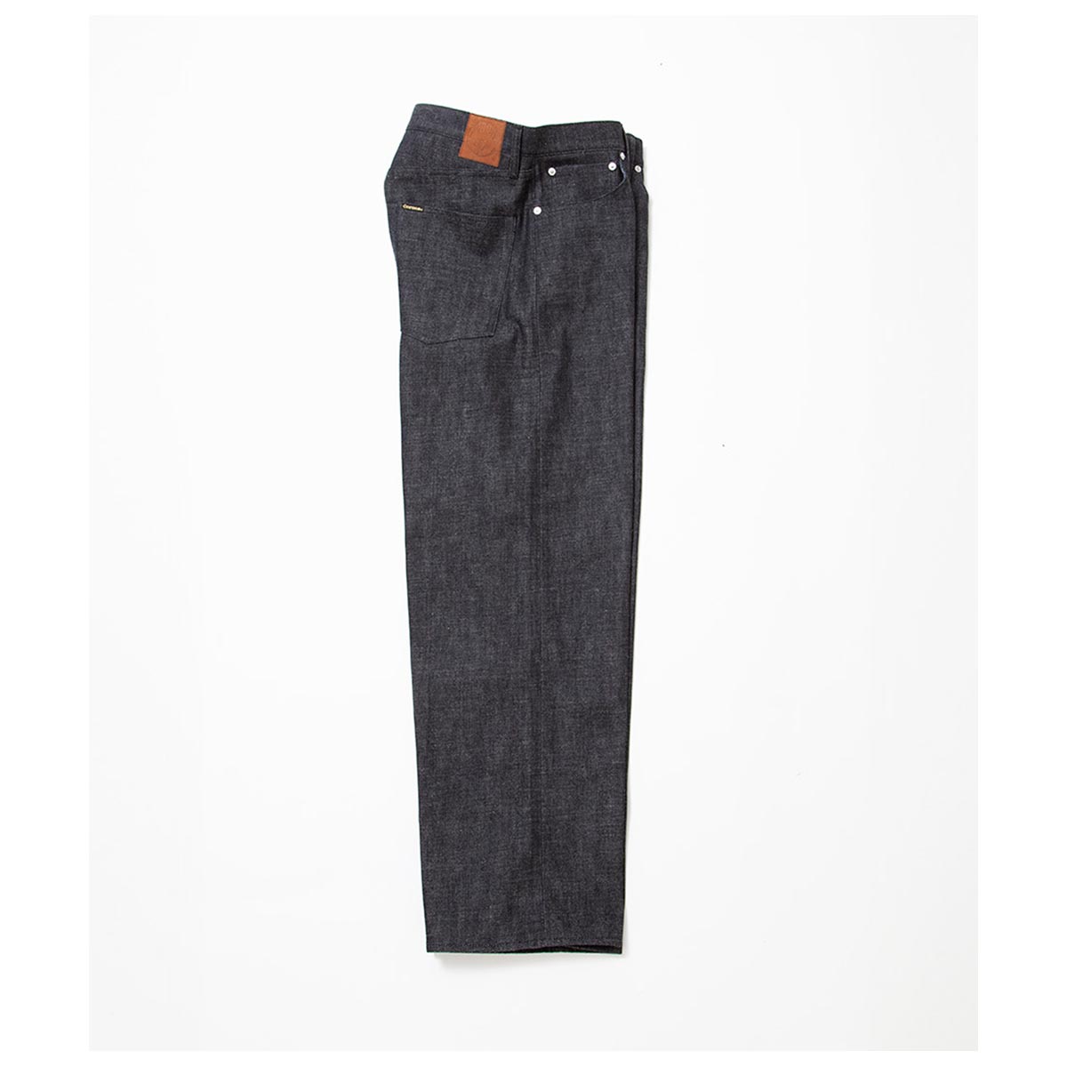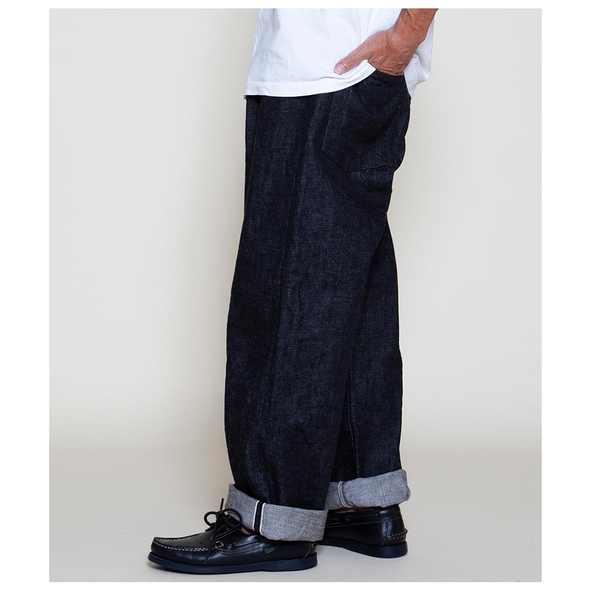 やや下がって配置された大きめのバックポケット、やや深い股上、そして太めのワタリ巾と膝巾を持つバギーシルエットが特徴です。