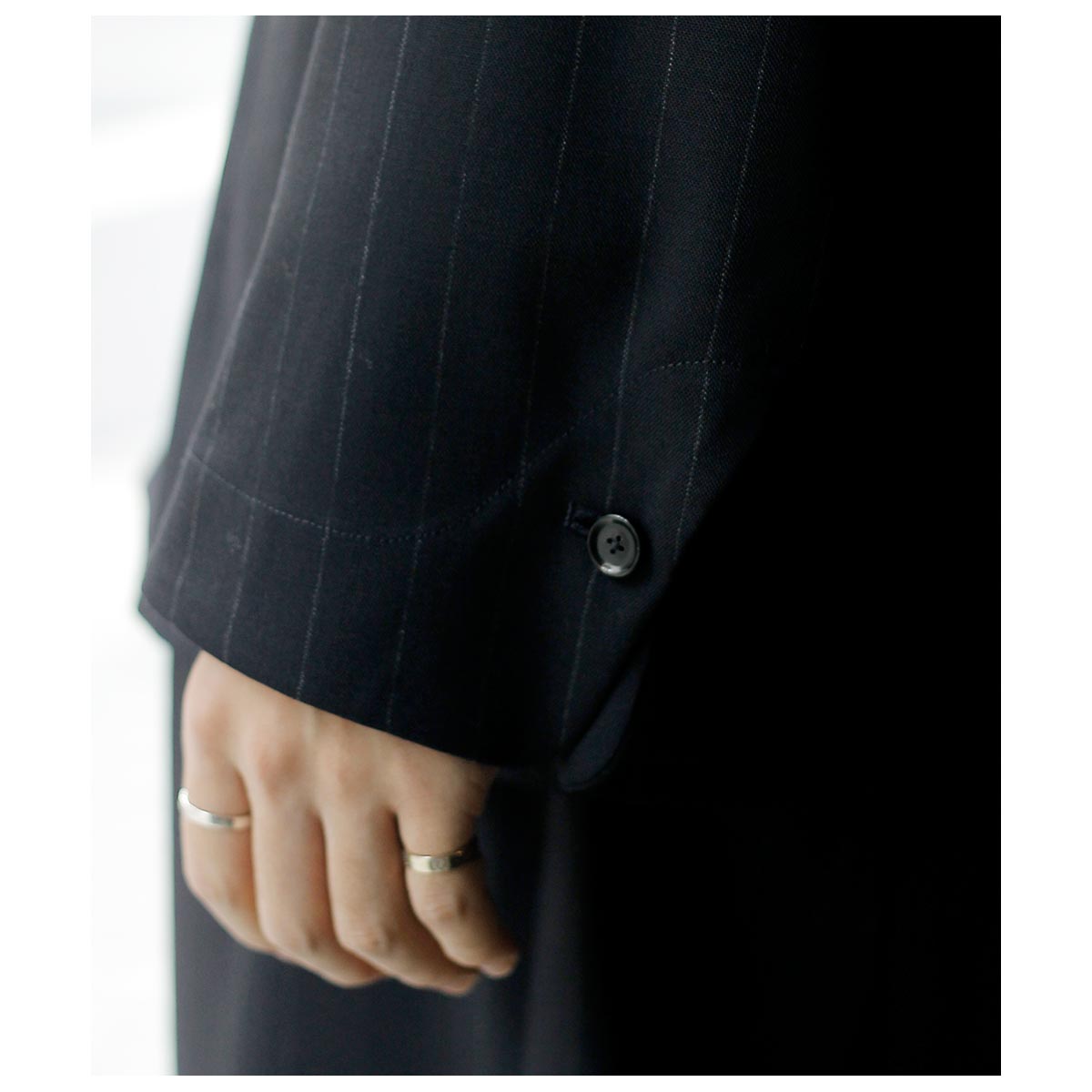 生地には細番手の強撚ウールのチョークストライプ生地を使用。春夏らしいシャリ感とハリ、程よい光沢が高級感を感じさせる素材です。