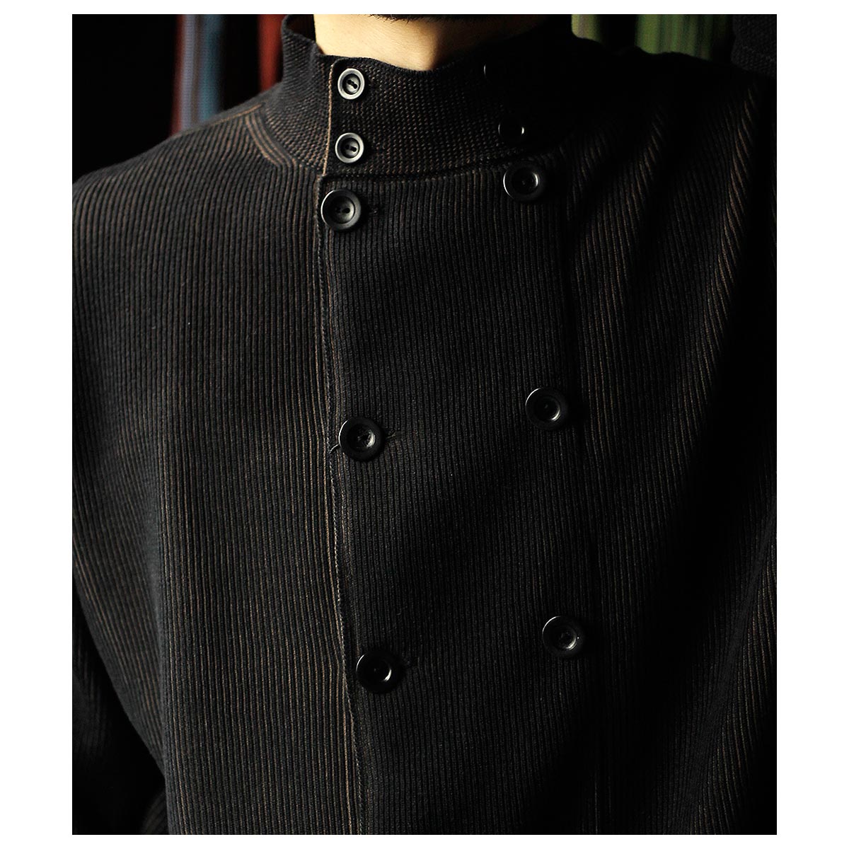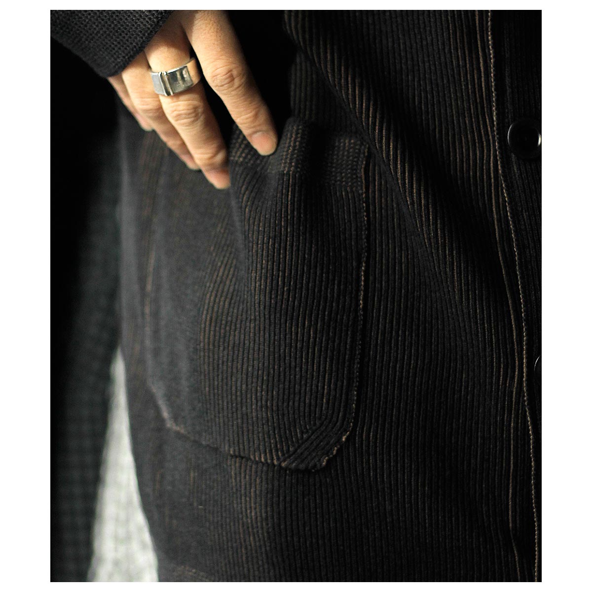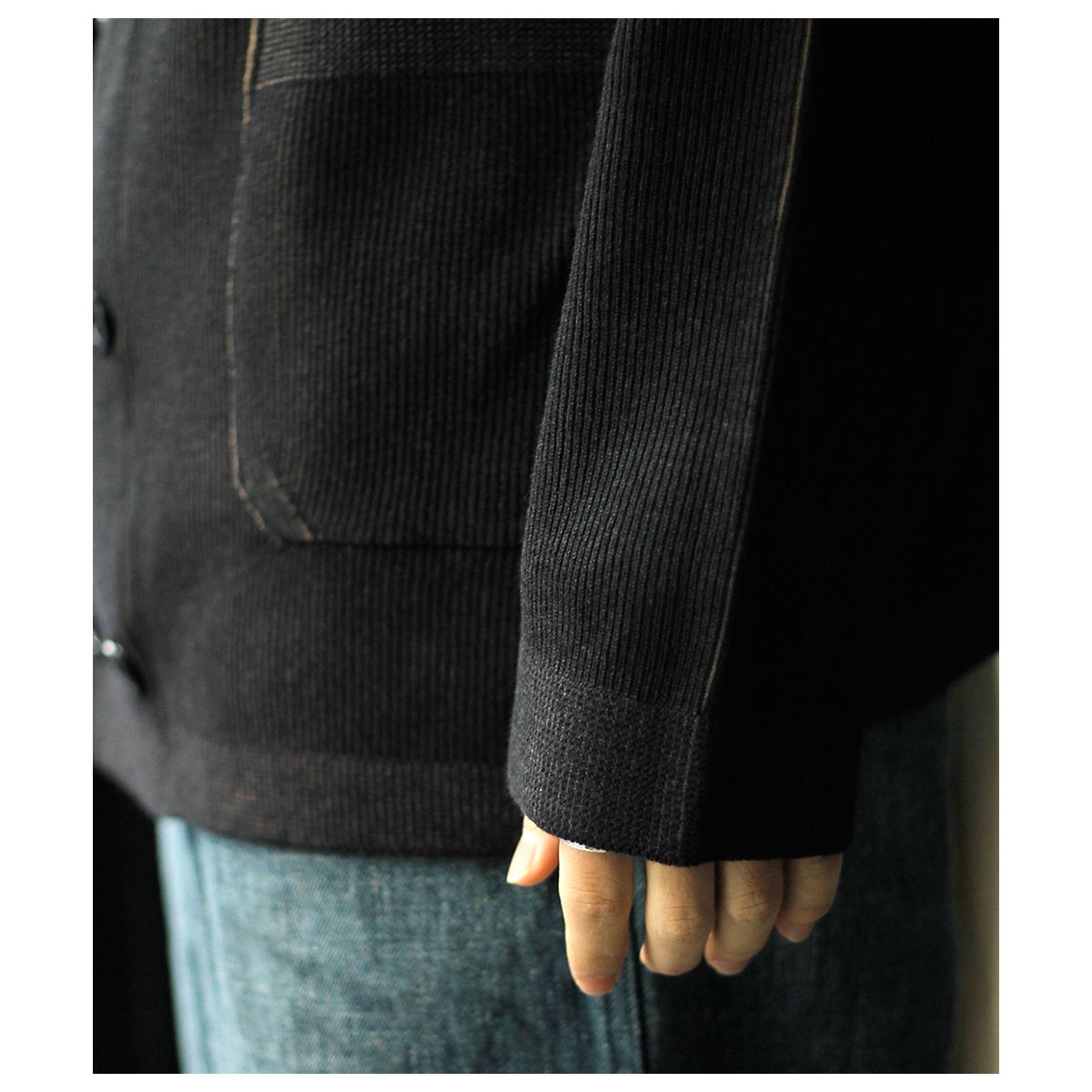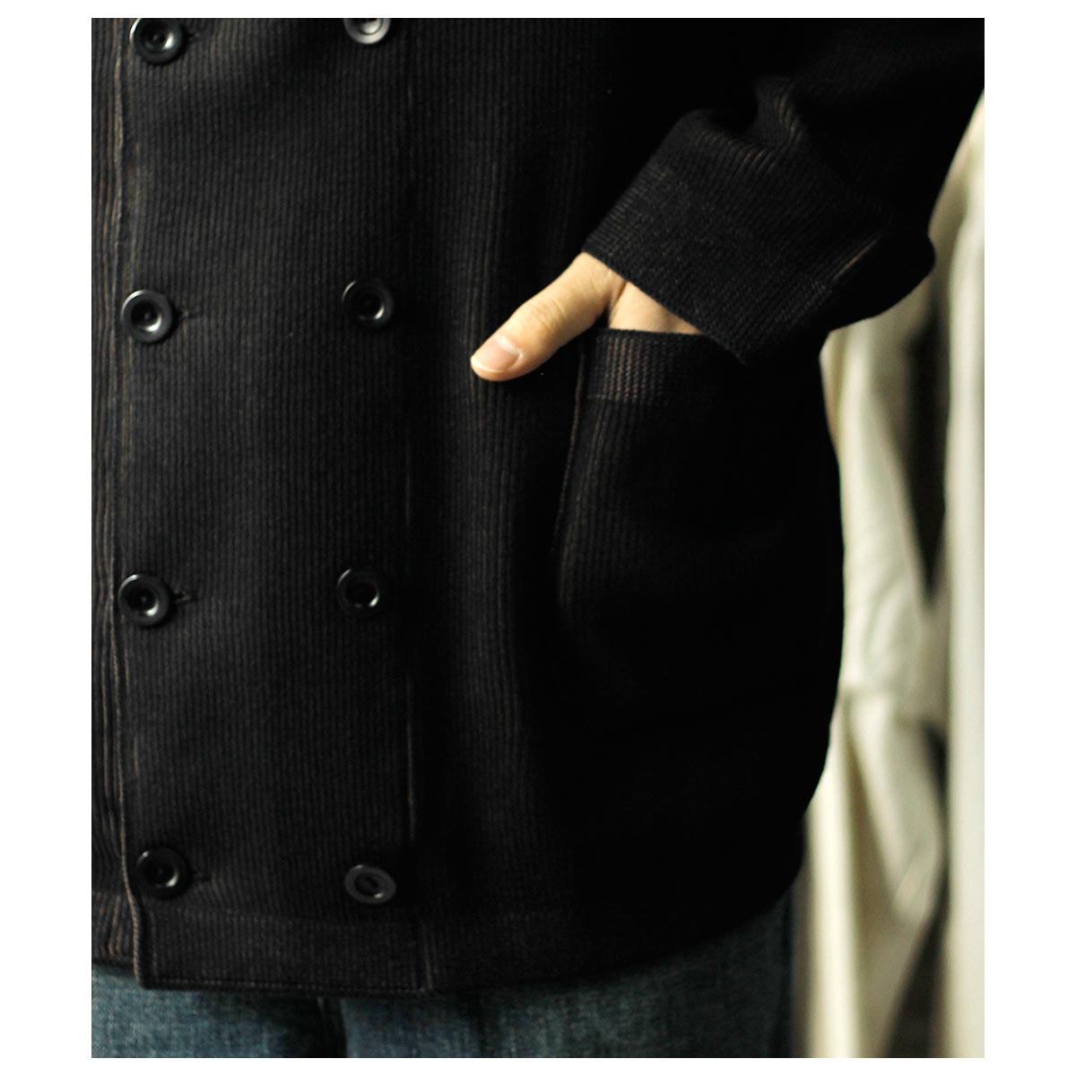 コットン100%糸を強撚加工し、ややざらっとしたタッチの両畦成形編み。100年前の度目を再現すべく、最後の切り札、ドイツ・ストール社の畦編機で今回ようやくヴィンテージのシッカリ感まで持ち込むことに成功。