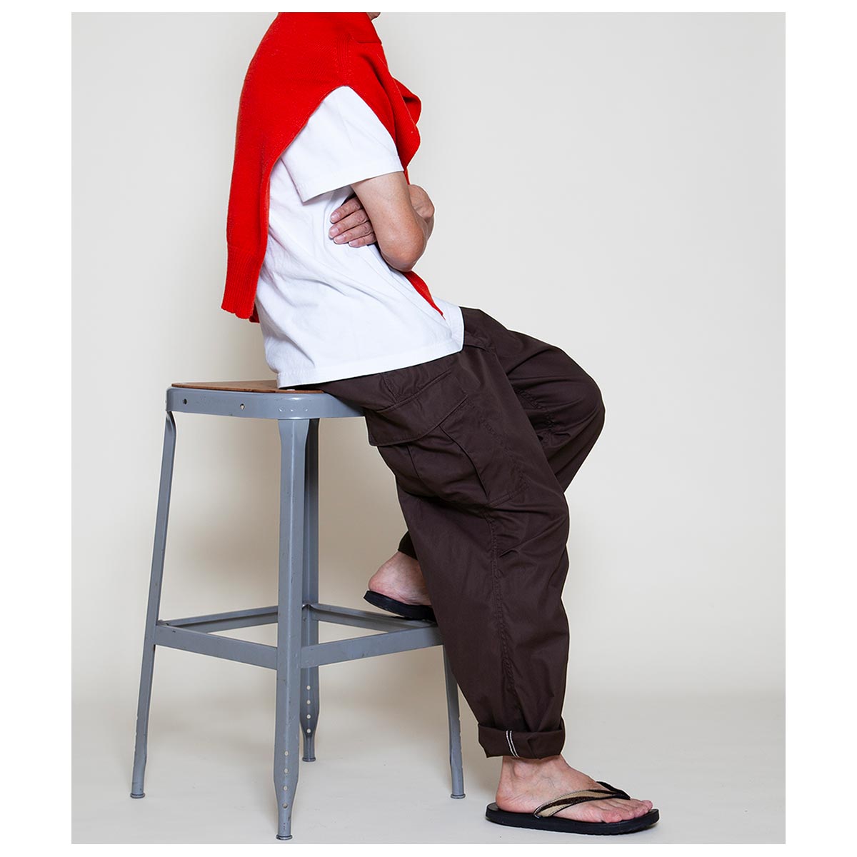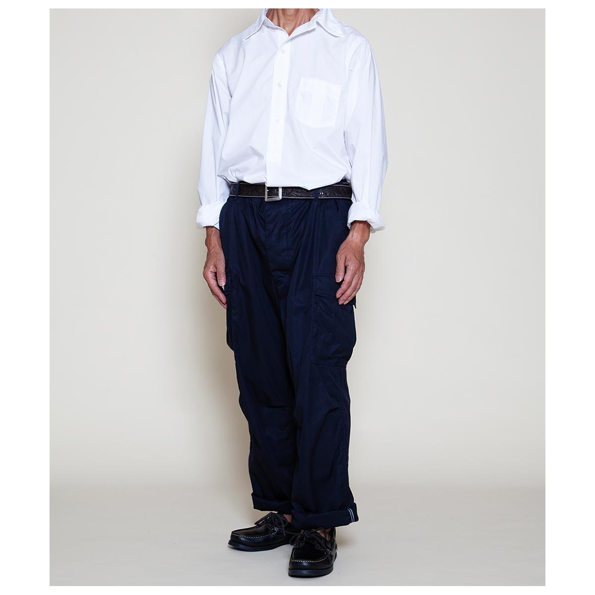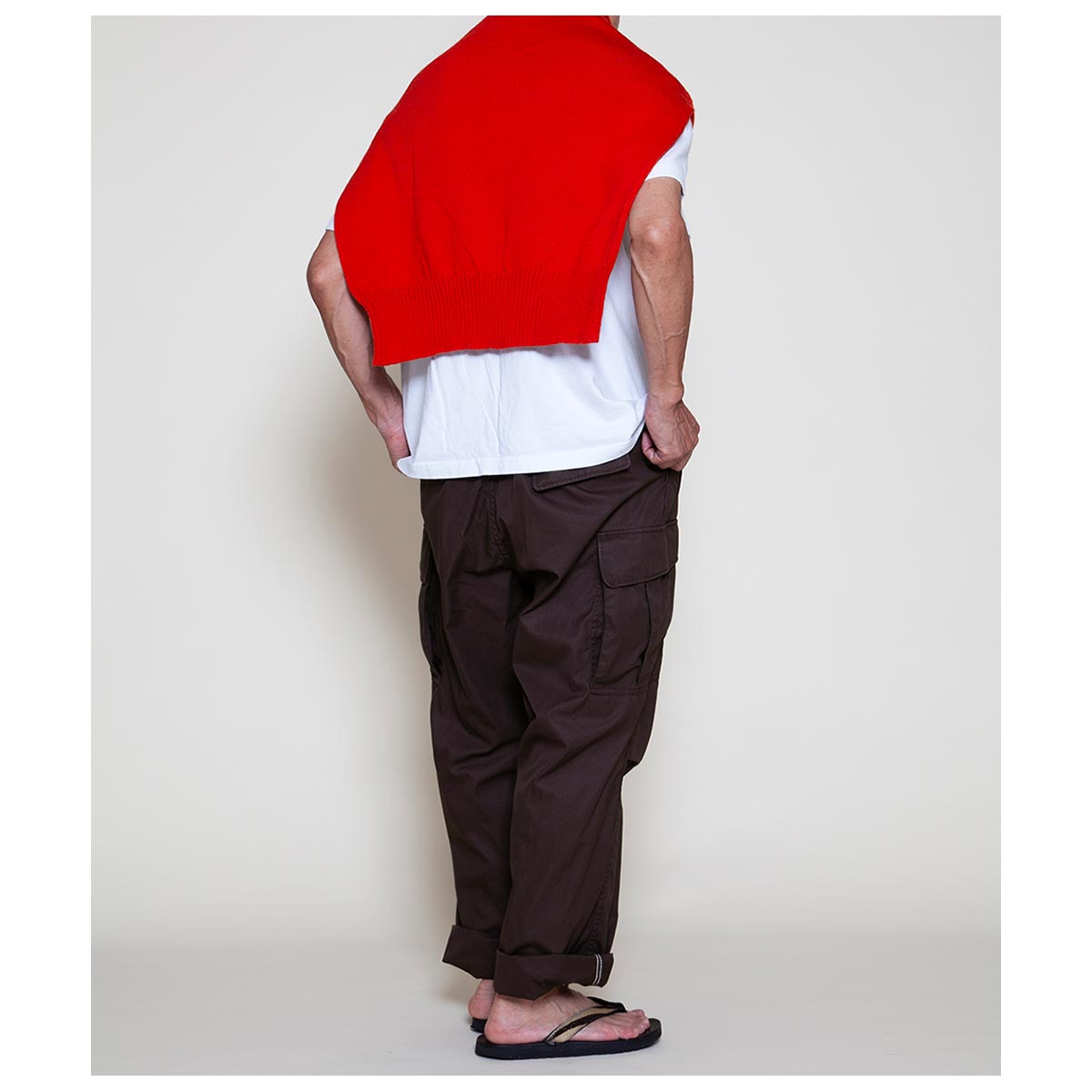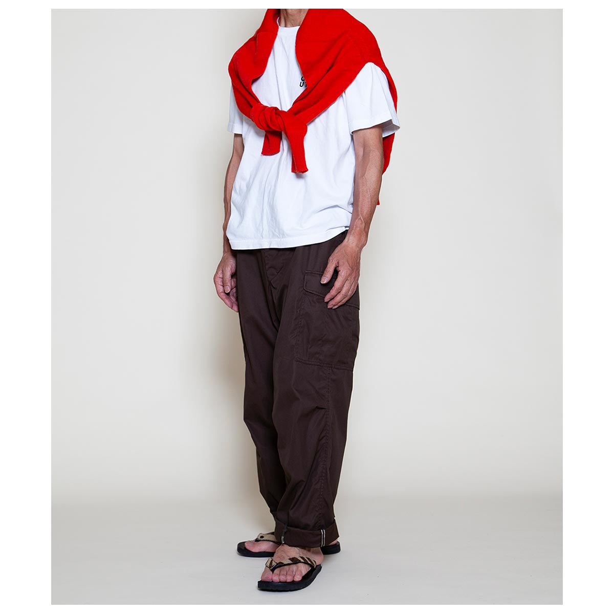 1960 年代ベトナム戦争で使用された米軍ジャングルファティーグパンツ(2ndモデル)に着想を得た、ブランドのシグニチャーアイテムです。ジャングル戦を想定した軽量かつ機能的な設計を継承し、ゆったりとしたシルエットと豊富なポケットが特徴。無駄を省いた「必要最低限の機能美」を体現しています。 独自に進化したやや太めのテーパードシルエットで、快適かつ洗練された履き心地を実現。カーゴポケットをコンパクトに改良し、重心を上部に設定することで、日常使いに最適なバランスとスタイルを提供します。