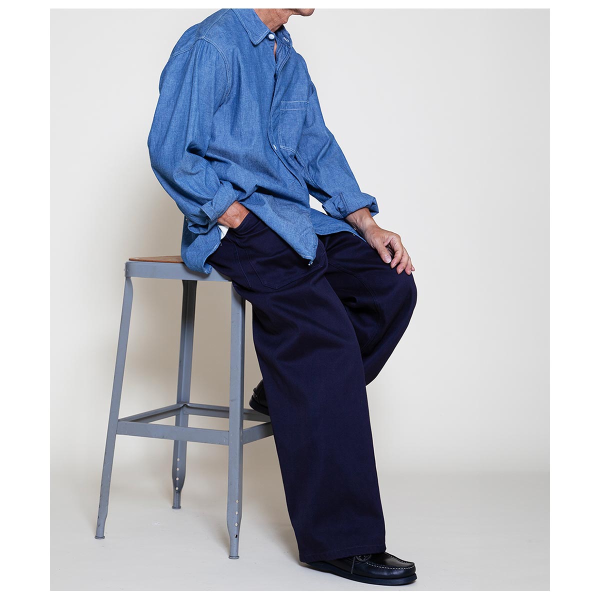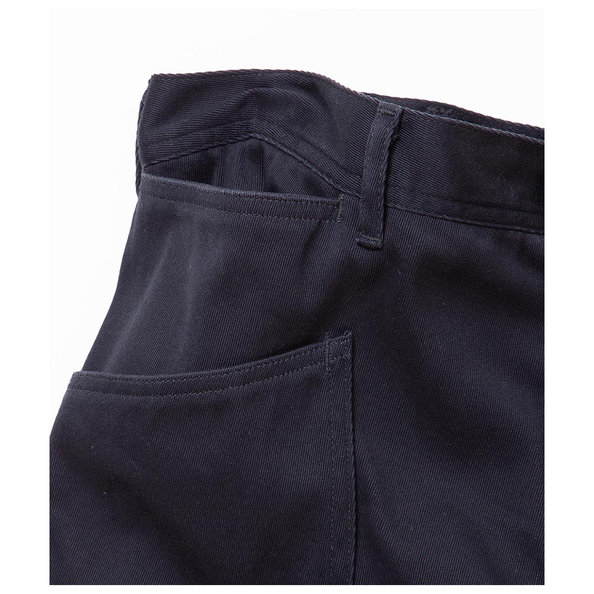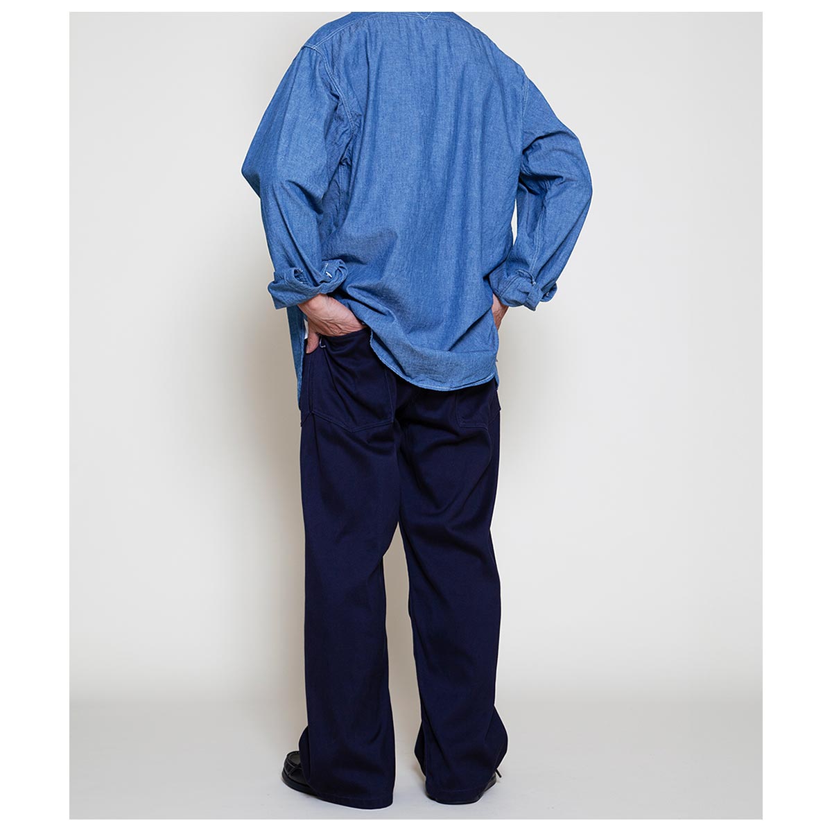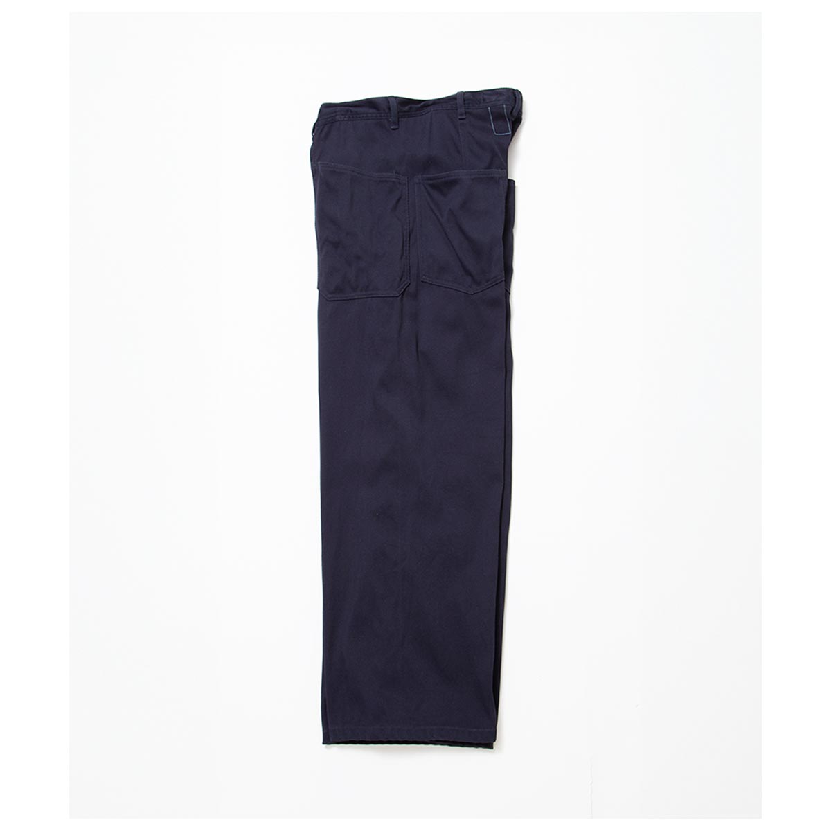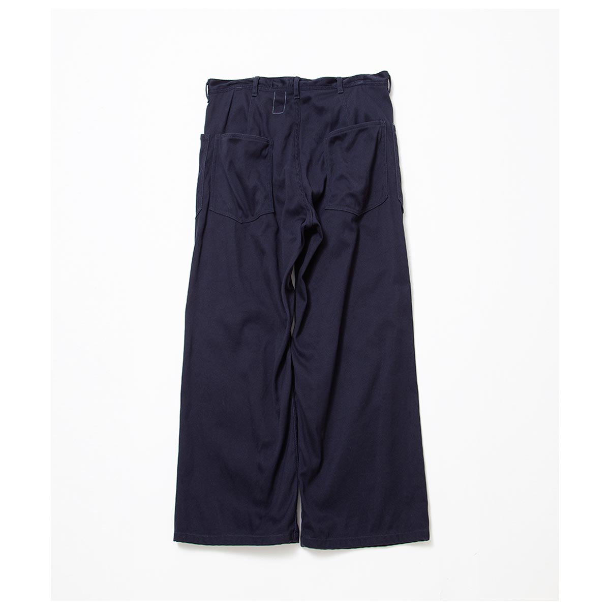 U.S. NAVYの甲板作業用ワークパンツにインスパイアされたアイテムです。 サイドシームのない太めのセーラーパンツシルエットが特徴。 テーパードを一切入れず、極太のバギーシルエットを採用。セーラーパンツ特有の裾広がりなフレアシルエットがとても新鮮です。 また、前後のパッチポケットは隙間なくぴったりと並び、低めの位置に配置されているため、手が入れやすい構造になっています。
