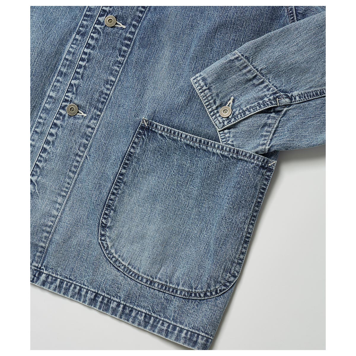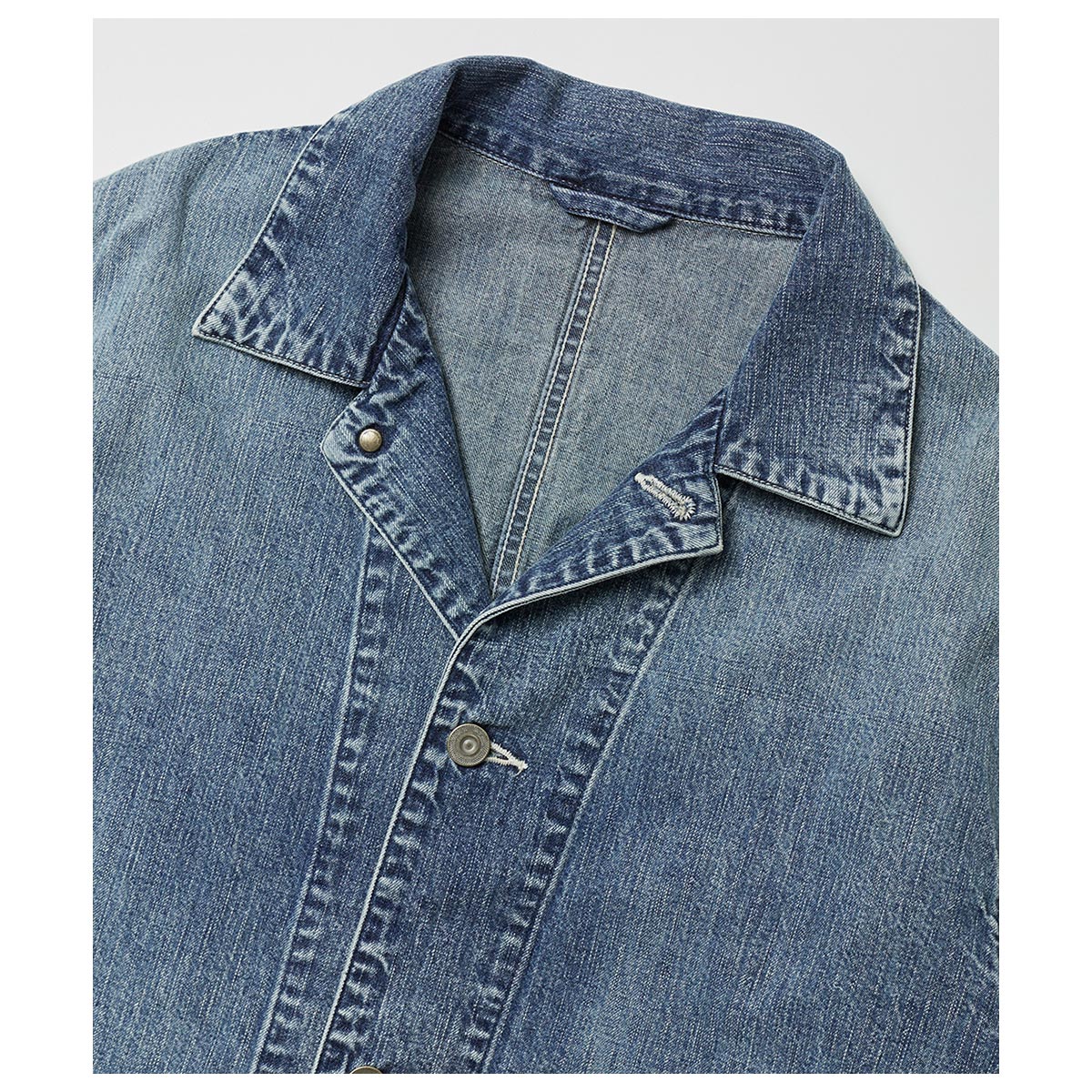 大戦期のカバーオールをベースに気負わず羽織れるパターンワークで仕上げたカバー オール。所謂ビンテージの色落ちとはまた違ったムードを目指し、手作業と洗い加工を いくつも組み合わながら、奥行きのあるフェードや色彩の濃淡を細かく調整して仕上げています。今季はさらに全体の色落ちを強くし、アタリ感やフェード感を強く反映させてアップデートしています。