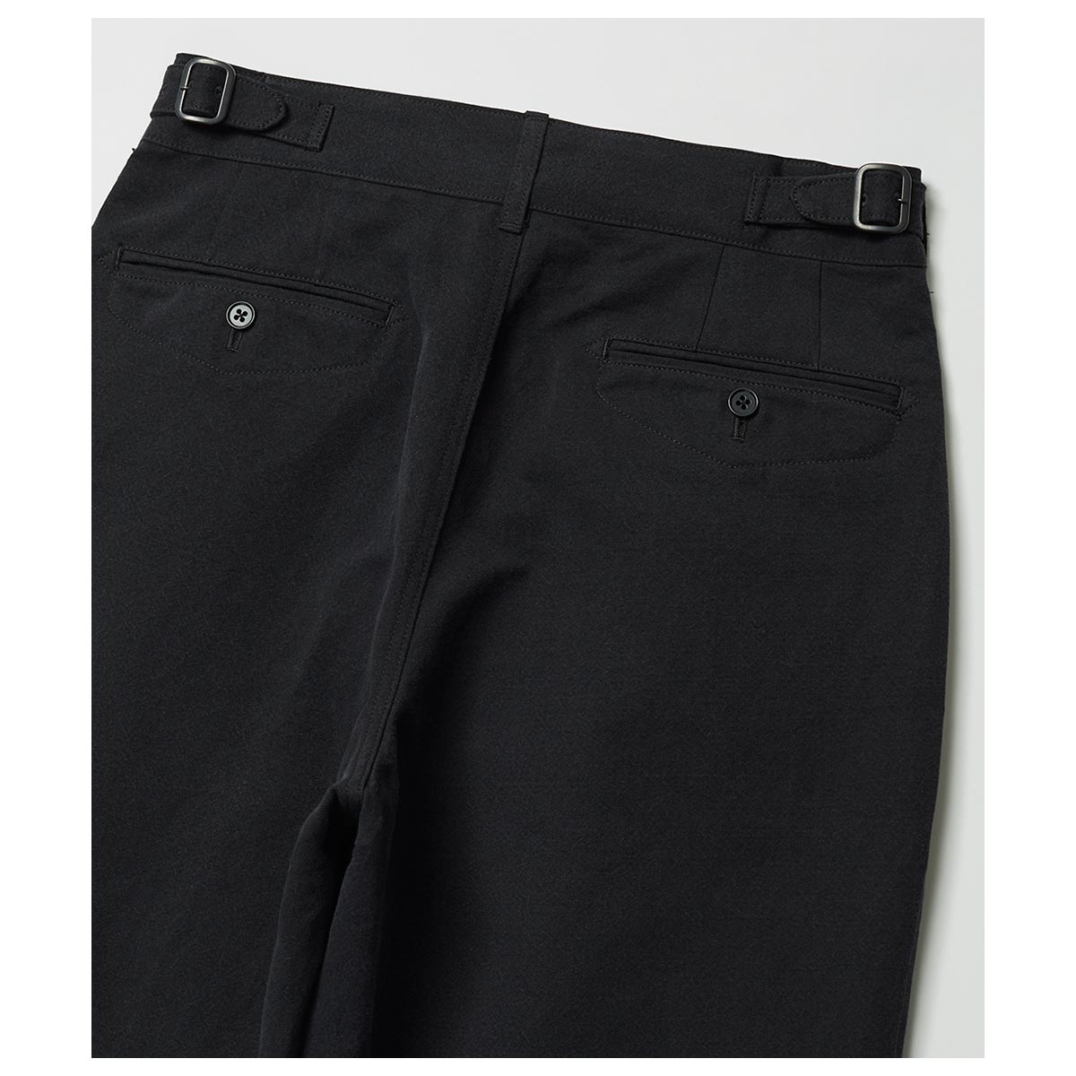 所謂ミリタリーのグルカパンツをベースとしたミリタリーパンツ。オリジナルの複雑な構造のベルト仕様の残像を残しながら、アジャスターベルトの仕様として簡素化することで、ストレスフリーに着用できるように仕上げています。
